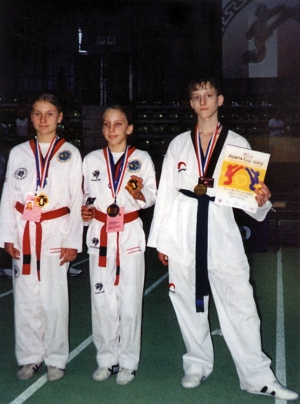 Úspě?ná reprezentace taekwondo WTF Sokola Rychvald - mistři Evropy ?actva (Asiana Cup 2003): Zuzana Rodovská, ?aneta Rodovská a Pavel Kaczur.