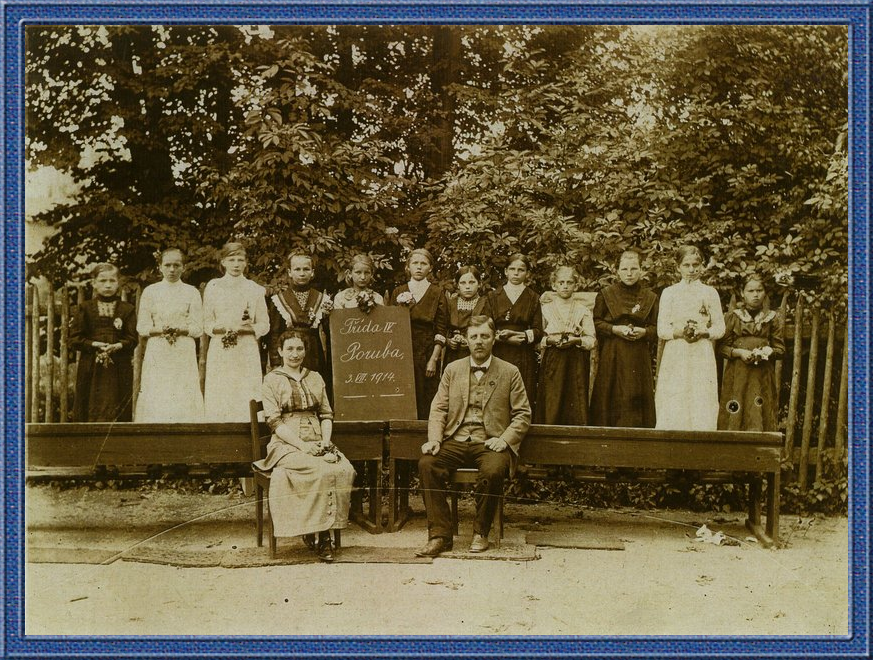 ? Po maturitě na Učitelském ústavě v Příboře v r.1890 jsem obdr?el své první učitelské místo na pětitřídní ?kole v Klimkovicích? 1.března 1894 jsem byl ustanoven za nadučitele na dvoutřídní ?kole v Porubě. Ze ?esti ?adatelů o toto místo jsem byl nejmlad?ím ? ve svých 24 a půl letech. To, ?e jsem se jím stal tak brzy, vděčím zejména tomu, ?e si porub?tí občané vá?ili mého otce a ?e mne znali jako dobrého učitele v sousedních Klimkovicích? Hned od samého počátku bylo mou snahou odstranit v?eobecné úlevy star?ím ?ákům. Získal jsem pro to starostu obce Antonína Bestu, který byl zároveň členem ?kolní rady. Mnozí rodiče ov?em nebyli s tímto na?ím sna?ením spokojeni, nechávali často děti doma, ale kdy? začali dostávat i peně?ité pokuty, vzdali se odporu a posílali své děti řádně do ?koly?? ?kola byla postupně roz?iřována. U? před válkou (1. světovou) měla 5 tříd. Sna?il jsem se ze v?ech sil, aby obec postavila novou ?kolní budovu, je? by vyhovoala potřebám doby, ale nepodařilo se to ani mně, ani mým přátelům. Místo ?koly byl postaven "Obecní dům" s byty pro učitele. V mém bývalém bytě byla zařízena čtvrtá učebna a pátá třída byla umístěna v novém obecním domě. Nové ?koly jsem se tedy nedočkal a celých 33 roků jsem musel učit v nevhodné a nehygienické budově. Při odchodu na odpočinek v r.1927 mně zemská ?kolní rada vyslovila pochvalné uznání."