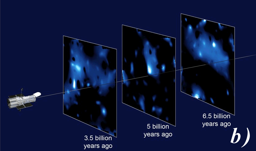 Nejnověj?í výzkumy prokazují, ?e temná hmota se s postupem času stále více shlukuje (a). Rozlo?ení temné hmoty v čase (zleva doprava): stav vzdálený 3,5 miliardy let, 5 miliard let a 6,5 miliardy let (b) |
