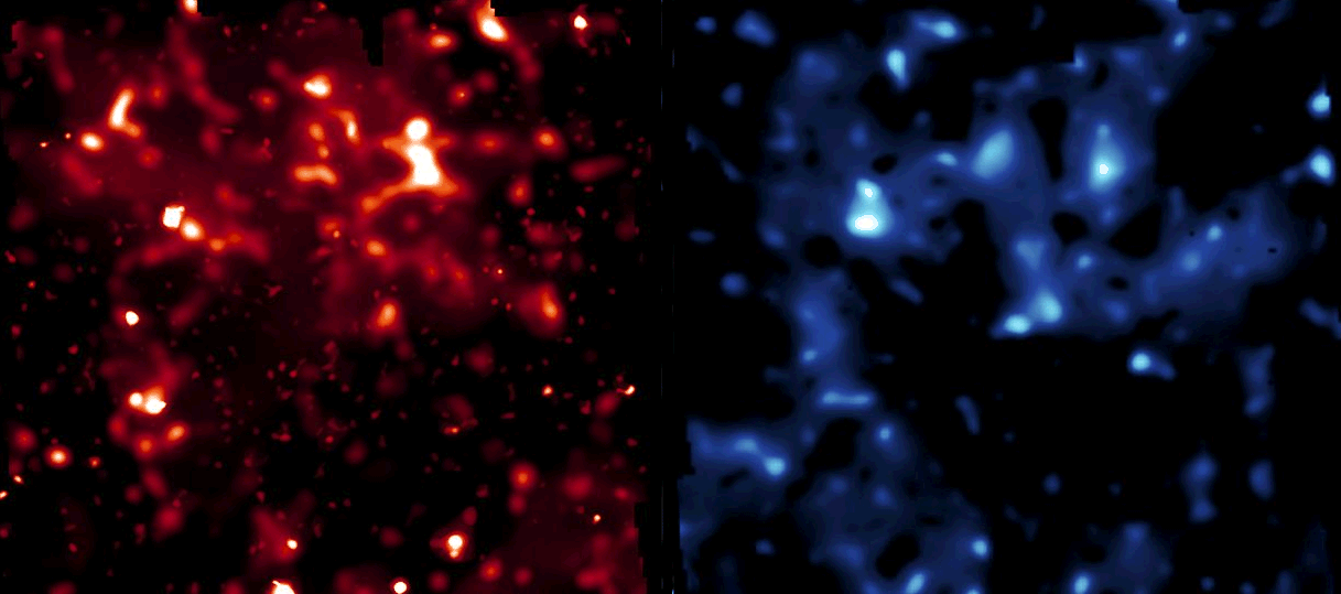 Snímek vyvedený ve fale?ných barvách znázorňuje rozlo?ení obyčejné viditelné hmoty (vlevo) a temné slo?ky kosmu (vpravo), přičem? jasnost odpovídá hustotě |